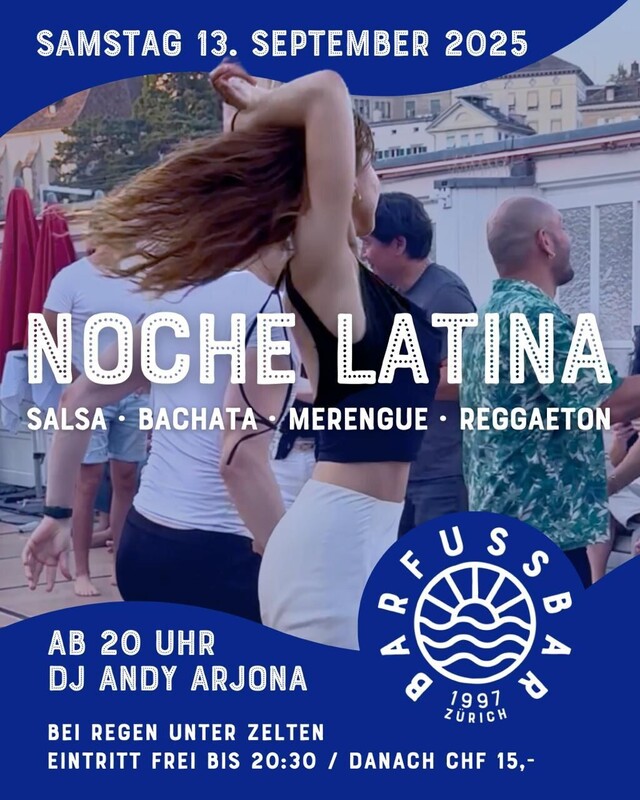 ✨ ¡Ven a BAILAR! ✨ …an der dritten und letzten NOCHE LATINA der Saison in der Barfussbar am Samstag, 13. September – Tanzen auf dem Fluss, unter Palmen, mitten im Herzen von Zürich❣️ 🥁 Freut euch auf unwiderstehliche Beats von DJ Andy Arjona: Salsa, Bachata, Merengue, Reggaeton y más! ⏱️ Türen öffnen um 20:00 Uhr – Eintritt frei bis 20:30 Uhr, danach CHF 15.–. Kommt am besten früh 😉 Die Musik läuft von 20:00–23:00 Uhr, Drinks gibt’s bis Mitternacht 🍹 Sollte es regnen, findet alles unter Zelten statt – die Party steigt auf jeden Fall, bei jedem Wetter! Wir freuen uns darauf, mit euch die Saison ausklingen zu lassen💃🏽🕺🏽 https://barfussbarallink-live-ec06e2148ae548b89-f5832a4.divio-media.net/filer_public/92/7f/927f0614-83b8-474c-adb7-8183784037b8/herbstprogramm.pdf