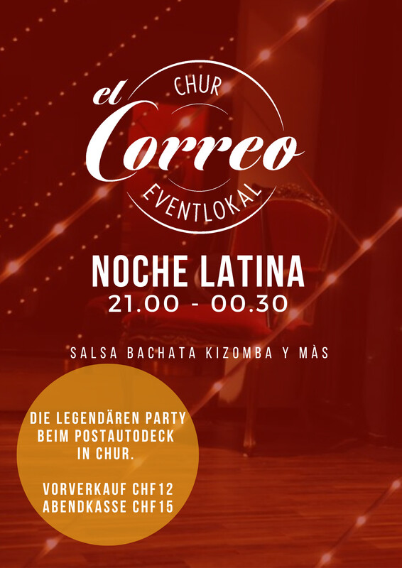 Die beliebte Noche Latina im El Correo Chur am Postautodeck. Tanze zu heissen Rhytmen und bring den Tanzboden zum glühen. Dj's aus Zürich, Deutschland, Cuba, Liechtenstein... geben jeweils den Takt an. Und wem es zu heiss wird, der kann sich an der Bar mit einem kühlen Drink abkühlen. Vorverkauf via Eventfrog: CHF 12 Abendkasse: CHF 15 https://www.facebook.com/ElCorreoChur