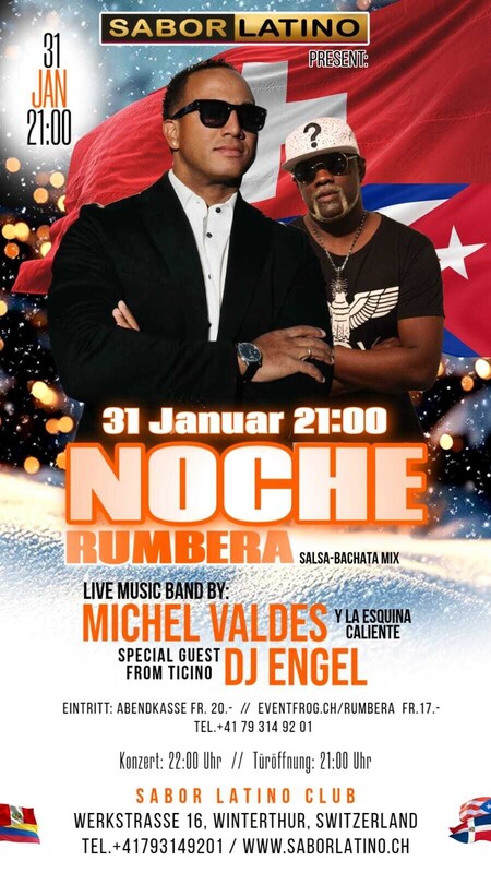 Sabor Latino Noche Rumbera Live & heiß wie die Karibik! 🔥🌴 Am 31. Januar ab 21:00 Uhr verwandelt sich der Sabor Latino Club in Winterthur in ein brodelndes Tanzmeer aus Salsa & Bachata. Freu dich auf Live-Musik von Michel Valdes y La Esquina Caliente, die mit kraftvollen Rhythmen, kubanischem Feuer und purer Lebensfreude die Tanzfläche zum Kochen bringen. Für perfekte Übergänge, volle Floors und beste Latin-Vibes sorgt Special Guest DJ Engel aus dem Tessin. Diese Noche Rumbera steht für echte Latin-Kultur, pulsierende Musik und eine Atmosphäre, die man nicht erklären muss – man erlebt sie. Eintritt: 💰 CHF 20.– an der Abendkasse 🎟️ CHF 17.– im Vorverkauf über Eventfrog.ch/rumbera Was dich erwartet: 💃🏽🕺🏽 Heisse Salsa- & Bachata-Rhythmen 🎶 Live Band & DJ 🔥 Authentische karibische Club-Atmosphäre 🌴 Tanz, Musik & pure Energie Eine Nacht, die du nicht nur hörst – sondern fühlst. No te lo pierdas! ✨ eventfrog.ch/rumbera