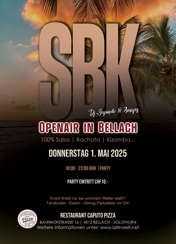 ⚠️ Der Event findet nur bei schönem Wetter statt. 👈🏽 Latinwelt präsentieren: ★SBK OPEN AIR PARTY IN BELLACH Tanzfläche Dj Segundo & Friends Salsa, Bachata, Merengue, Cha cha, Kizomba, Son! ★Zeit: 18.00 Uhr bis 23:00 Uhr Party ★Preis: CHF 10.- Eintritt Party ★Informationen: - Tanzboden - Essen: Pizza, Pasta, Grill... - Der Event findet nur bei schönem Wetter statt. - 15 Minuten zu Fuss vom bahnhof Bellach - 5 Minuten mit dem Auto von Solothurn - genug Parkplätze vor Ort weitere Informationen unter www.latinwelt.net Anmeldung nicht zwingend.