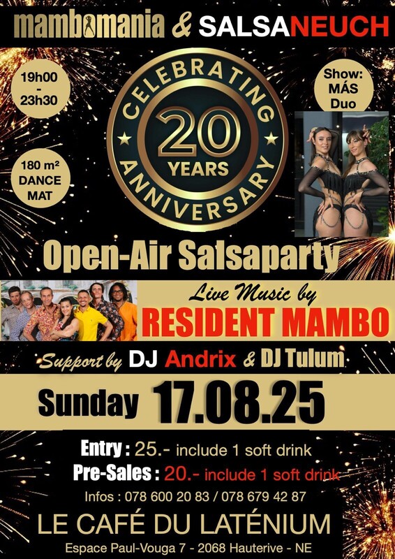 Live music by Resident Mambo (Berne) 🎵 🎧 Support by DJ Tulum & DJ Andrix 🎧 💃🏼Show by «Más Duo»💃🏼 🎂 20 years celebration of Mambomania & Salsaneuch 🎂 ✅ Café du Laténium, Espace Paul-Vouga 7/2068 Hauterive(NE) ✅ 19h00 - 23h30 ✅ with view on the lake and the montains ✅ Dance mat 180 m2 ✅ free parking 100 m away Entry: CHF 25.- ( include 1 soft drink) Pre-sales: CHF 20.- ( include 1 soft drink) --> TWINT 078 / 679 42 87 ( with first and last name https://fb.me/e/8a6osbxyY