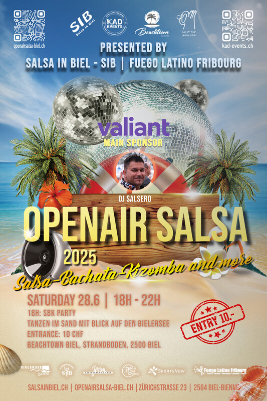 Wir sind begeistert, euch mitteilen zu dürfen, dass das jährliche Openair Salsa dieses Jahr wieder stattfinden wird! Doch das ist noch nicht alles - wir haben neu dieses Jahr 3 verschieden Standorte! Es wird eine grossartige Gelegenheit sein, unter freiem Himmel zu tanzen, die pulsierenden Rhythmen der SBK-Musik zu geniessen und gemeinsam unvergessliche Momente zu erleben. Egal, ob ihr Anfänger seid oder schon erfahrene Tänzer, unsere Veranstaltungen sind für alle geeignet, die die Leidenschaft für Salsa, Bachata und Kizomba teilen. Wir freuen uns schon jetzt darauf, euch zahlreich wieder an unserem Openair Salsa in Biel willkommen zu heissen. Lasst uns gemeinsam die Tanzfläche zum Beben bringen und eine unvergessliche Zeit erleben! Wir sind stolz anzukündigen, dass die DJ Kad, DJ Volcano, DJ Bomba und DJ Salsero erneut die Bühne rocken werden! Mit ihrer einzigartigen Auswahl an Songs und ihrem Talent, die Menge zum Tanzen zu bringen, werden sie die Nacht zum Leuchten bringen. Lasst uns gemeinsam die Magie des Salsa, Bachata und Kizomba erleben und die schöne Sommerzeit geniessen! Wir freuen uns darauf, euch zahlreich bei unserem Openair Salsa in Biel willkommen zu heissen. 🎶💃🕺 Daten: 21.6, 19.7, 9.8.2025 - Stadtpark Biel Adresse: Bubenberg-Strasse 53, 2502 Biel GOOGLE MAP Daten: 28.6.2025 - Beachtown Adresse: Strandboden, 2500 Biel GOOGLE MAP Daten: 5.7, 16.8.2025 - Joran Platz Adresse: Badhausstrasse 1, 2503 Biel GOOGLE MAP Eintritt: CHF 10.- ohne Liveband | CHF 15.- mit Liveband ----- 🇫🇷 🇫🇷 🇫🇷 🇫🇷 ----- Nous sommes ravis de vous annoncer que l’Openair Salsa annuel aura de nouveau lieu cette année ! Et ce n’est pas tout — pour la première fois, nous avons trois lieux différents! Ce sera une occasion exceptionnelle de danser en plein air, de profiter des rythmes vibrants de la musique SBK (Salsa, Bachata, Kizomba) et de partager ensemble des moments inoubliables. Que vous soyez débutants ou danseurs expérimentés, nos événements sont ouverts à tous ceux qui partagent la passion de la Salsa, de la Bachata et de la Kizomba. Nous nous réjouissons déjà de vous accueillir nombreux à l’Openair Salsa de Bienne. Ensemble, faisons vibrer la piste de danse et vivons des instants mémorables ! Nous sommes fiers d’annoncer que DJ Kad, DJ Volcano, DJ Bomba et DJ Salsero enflammeront à nouveau la scène ! Avec leur sélection unique de morceaux et leur talent pour faire danser la foule, ils illumineront la soirée. Venez partager avec nous la magie de la Salsa, de la Bachata et de la Kizomba et savourons ensemble la belle saison estivale ! Nous avons hâte de vous retrouver nombreux à notre Openair Salsa à Bienne. 🎶💃🕺 Dates: 21.6, 19.7, 9.8.2025 - Parc municipal Bienne Adresse: Bubenberg-Strasse 53, 2502 Bienne GOOGLE MAP Dates: 28.6.2025 - Beachtown Adresse: Sol de la plage, 2500 Bienne GOOGLE MAP Dates: 5.7, 16.8.2025 - Place du Joran Adresse: Badhausstrasse 1, 2503 Bienne GOOGLE MAP Entrée: CHF 10.- sans Liveband | CHF 15.- avec Liveband --- MAIN SPONSORS: Valiant CO SPONSORS: SportsNow, Pilates Biel GmbH PARTNER: Bielersee Gastro, Joran Restaurant, Beachtown, Le p’tit Schluck Homepage: www.openairsalsa-biel.ch | www.salsainbiel.ch Facebook: https://www.facebook.com/openairsalsa | https://www.facebook.com/profile.php?id=100015507362841 Instagram: https://www.instagram.com/salsainbiel/ | https://www.instagram.com/fuego_latino_fribourg/