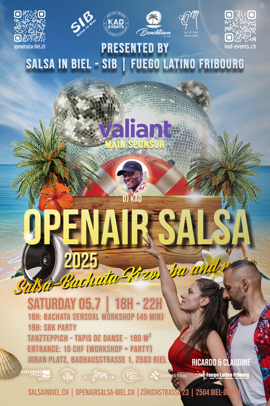 Wir sind begeistert, euch mitteilen zu dürfen, dass das jährliche Openair Salsa dieses Jahr wieder stattfinden wird! Doch das ist noch nicht alles - wir haben neu dieses Jahr 3 verschieden Standorte! Es wird eine grossartige Gelegenheit sein, unter freiem Himmel zu tanzen, die pulsierenden Rhythmen der SBK-Musik zu geniessen und gemeinsam unvergessliche Momente zu erleben. Egal, ob ihr Anfänger seid oder schon erfahrene Tänzer, unsere Veranstaltungen sind für alle geeignet, die die Leidenschaft für Salsa, Bachata und Kizomba teilen. Wir freuen uns schon jetzt darauf, euch zahlreich wieder an unserem Openair Salsa in Biel willkommen zu heissen. Lasst uns gemeinsam die Tanzfläche zum Beben bringen und eine unvergessliche Zeit erleben! Wir sind stolz anzukündigen, dass die DJ Kad, DJ Volcano, DJ Bomba und DJ Salsero erneut die Bühne rocken werden! Mit ihrer einzigartigen Auswahl an Songs und ihrem Talent, die Menge zum Tanzen zu bringen, werden sie die Nacht zum Leuchten bringen. Lasst uns gemeinsam die Magie des Salsa, Bachata und Kizomba erleben und die schöne Sommerzeit geniessen! Wir freuen uns darauf, euch zahlreich bei unserem Openair Salsa in Biel willkommen zu heissen. 🎶💃🕺 Daten: 21.6, 19.7, 9.8.2025 - Stadtpark Biel Adresse: Bubenberg-Strasse 53, 2502 Biel GOOGLE MAP Daten: 28.6.2025 - Beachtown Adresse: Strandboden, 2500 Biel GOOGLE MAP Daten: 5.7, 16.8.2025 - Joran Platz Adresse: Badhausstrasse 1, 2503 Biel GOOGLE MAP Eintritt: CHF 10.- ohne Liveband | CHF 15.- mit Liveband ----- 🇫🇷 🇫🇷 🇫🇷 🇫🇷 ----- Nous sommes ravis de vous annoncer que l’Openair Salsa annuel aura de nouveau lieu cette année ! Et ce n’est pas tout — pour la première fois, nous avons trois lieux différents! Ce sera une occasion exceptionnelle de danser en plein air, de profiter des rythmes vibrants de la musique SBK (Salsa, Bachata, Kizomba) et de partager ensemble des moments inoubliables. Que vous soyez débutants ou danseurs expérimentés, nos événements sont ouverts à tous ceux qui partagent la passion de la Salsa, de la Bachata et de la Kizomba. Nous nous réjouissons déjà de vous accueillir nombreux à l’Openair Salsa de Bienne. Ensemble, faisons vibrer la piste de danse et vivons des instants mémorables ! Nous sommes fiers d’annoncer que DJ Kad, DJ Volcano, DJ Bomba et DJ Salsero enflammeront à nouveau la scène ! Avec leur sélection unique de morceaux et leur talent pour faire danser la foule, ils illumineront la soirée. Venez partager avec nous la magie de la Salsa, de la Bachata et de la Kizomba et savourons ensemble la belle saison estivale ! Nous avons hâte de vous retrouver nombreux à notre Openair Salsa à Bienne. 🎶💃🕺 Dates: 21.6, 19.7, 9.8.2025 - Parc municipal Bienne Adresse: Bubenberg-Strasse 53, 2502 Bienne GOOGLE MAP Dates: 28.6.2025 - Beachtown Adresse: Sol de la plage, 2500 Bienne GOOGLE MAP Dates: 5.7, 16.8.2025 - Place du Joran Adresse: Badhausstrasse 1, 2503 Bienne GOOGLE MAP Entrée: CHF 10.- sans Liveband | CHF 15.- avec Liveband --- MAIN SPONSORS: Valiant CO SPONSORS: SportsNow, Pilates Biel GmbH PARTNER: Bielersee Gastro, Joran Restaurant, Beachtown, Le p’tit Schluck Homepage: www.openairsalsa-biel.ch | www.salsainbiel.ch Facebook: https://www.facebook.com/openairsalsa | https://www.facebook.com/profile.php?id=100015507362841 Instagram: https://www.instagram.com/salsainbiel/ | https://www.instagram.com/fuego_latino_fribourg/