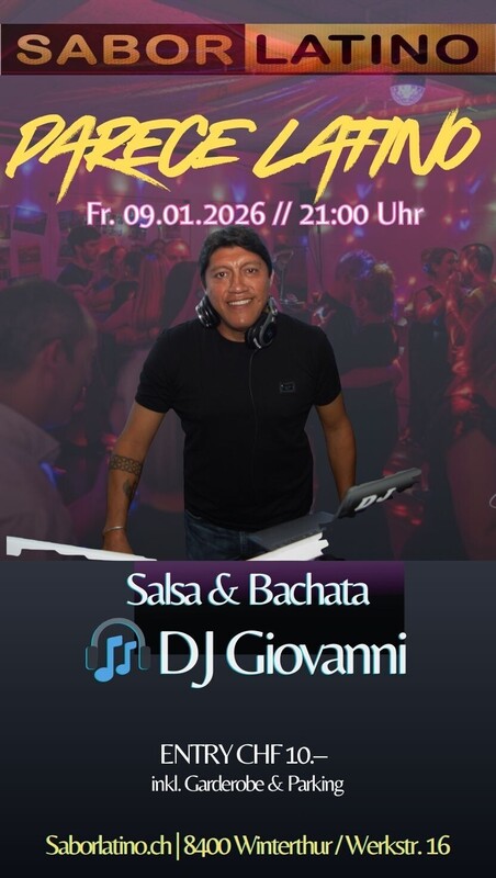 Parece Latino – Salsa & Bachata Fridays im Sabor Latino Freitag ist Latino-Zeit! 💃🕺 Parece Latino ist deine wöchentliche Salsa- & Bachata-Party im Sabor Latino – jeden Freitag (ausser am 3. Freitag) mit wechselnden DJs und bester Tanzstimmung. Diese Woche sorgt DJ Giovanni für feinste Salsa- & Bachata-Sounds und garantiert eine volle Tanzfläche, gute Vibes und lange Nächte. Egal ob Anfänger:in oder erfahrene:r Tänzer:in – hier findest du alles, was du für einen perfekten Tanzabend brauchst: ✨ gute Musik ✨ viel Platz zum Tanzen ✨ eine offene, herzliche Community ✨ Bar, Garderobe & Parking inklusive Komm vorbei und starte dein Wochenende mit Parece Latino! Im Sabor Latino gibt es auch eine Tanzschule: www.bailemos.ch https://saborlatino.ch/events/parece-latino/