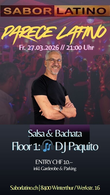 Parece Latino – Salsa & Bachata Fridays im Sabor Latino Freitag ist Latino-Zeit! 💃🕺 Parece Latino ist deine wöchentliche Salsa- & Bachata-Party im Sabor Latino – jeden Freitag (ausser am 3. Freitag) mit wechselnden DJs und bester Tanzstimmung. Diese Woche sorgt DJ Paquito für feinste Salsa- & Bachata-Sounds und garantiert eine volle Tanzfläche, gute Vibes und lange Nächte. Egal ob Anfänger:in oder erfahrene:r Tänzer:in – hier findest du alles, was du für einen perfekten Tanzabend brauchst: ✨ gute Musik ✨ viel Platz zum Tanzen ✨ eine offene, herzliche Community ✨ Bar, Garderobe & Parking inklusive Komm vorbei und starte dein Wochenende mit Parece Latino! Im Sabor Latino gibt es auch eine Tanzschule: www.bailemos.ch https://saborlatino.ch/events/parece-latino/