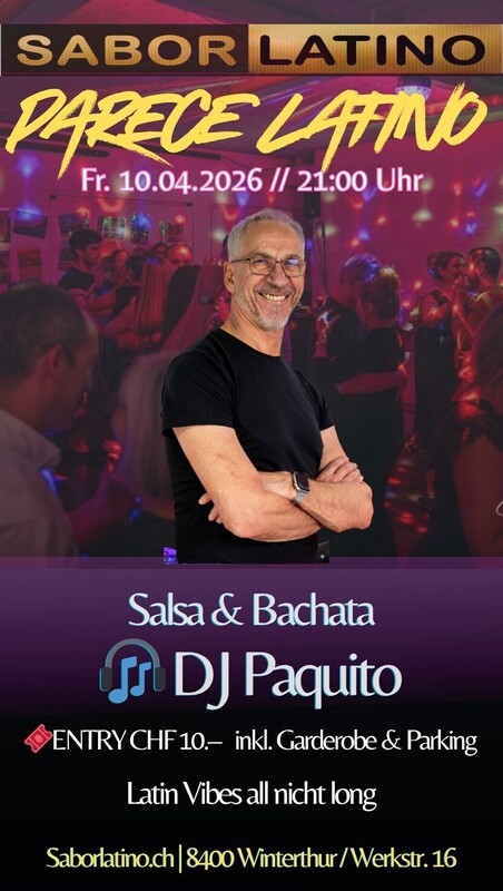 Parece Latino – Salsa & Bachata Fridays im Sabor Latino Freitag ist Latino-Zeit! 💃🕺 Parece Latino ist deine wöchentliche Salsa- & Bachata-Party im Sabor Latino – jeden Freitag (ausser am 3. Freitag) mit wechselnden DJs und bester Tanzstimmung. Diese Woche sorgt DJ Paquito für feinste Salsa- & Bachata-Sounds und garantiert eine volle Tanzfläche, gute Vibes und lange Nächte. Egal ob Anfänger:in oder erfahrene:r Tänzer:in – hier findest du alles, was du für einen perfekten Tanzabend brauchst: ✨ gute Musik ✨ viel Platz zum Tanzen ✨ eine offene, herzliche Community ✨ Bar, Garderobe & Parking inklusive Komm vorbei und starte dein Wochenende mit Parece Latino! Im Sabor Latino gibt es auch eine Tanzschule: www.bailemos.ch https://saborlatino.ch/events/parece-latino/