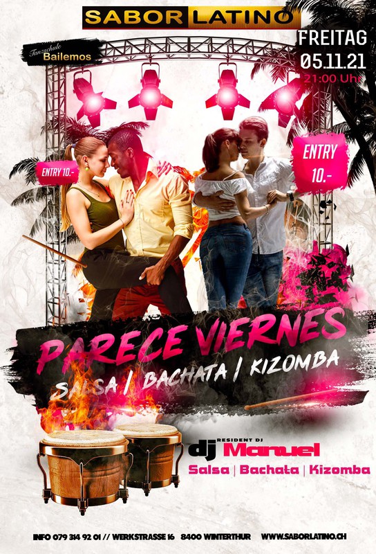 Die richtige Party um das Wochenende richtig zu beginnen. DJ Manuel: Salsa, Bachata, Kizomba Für diese Veranstaltung ist ein Covidzertifikat gemäss BAG vorgeschrieben. Dieses Zertifikat bekommt man im Testzentrum Winterthur und in der Stadt Winterthur hat es Testzelte in denen man sich auch spontan und bis nach Mitternacht testen lassen kann Im Sabor Latino gibt es auch eine Tanzschule: www.bailemos.ch Weniger anzeigen