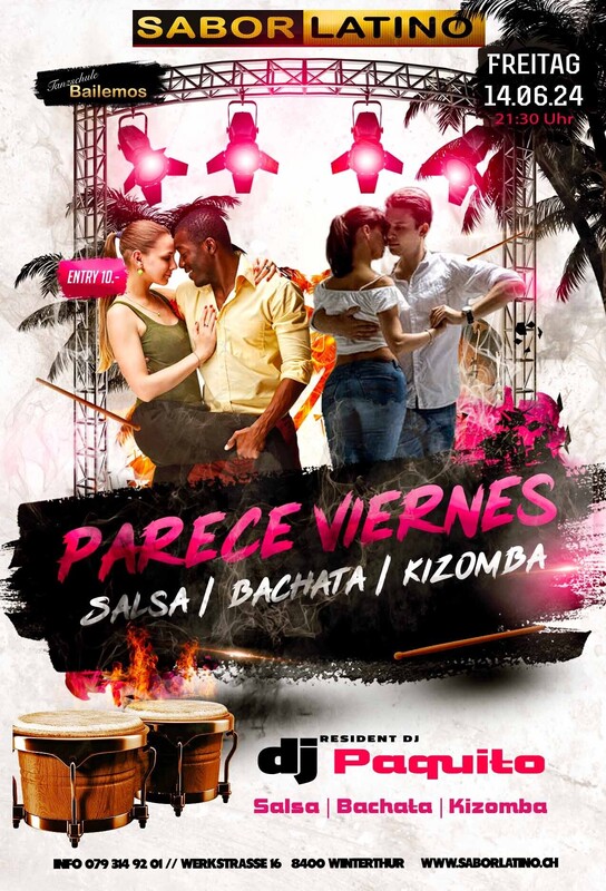 Die richtige Party, um das Wochenende zu beginnen. Mit wechselnden DJ`s immer Salsa, Bachata und Kizomba und auch mal Reggaeton. DJ Paquito: Salsa, Bachata, Kizomba Free Parking vor dem Club und mit dem ÖV ist das Sabor Latino einfach erreichbar bis Haltestelle Grüzenstrasse oder Brücke. Auch die Nachtbusse fahren im 1/2 Stundentakt an und ab diesen Haltestellen. Im Sabor Latino gibt es auch eine Tanzschule: www.bailemos.ch www.saborlatino.ch