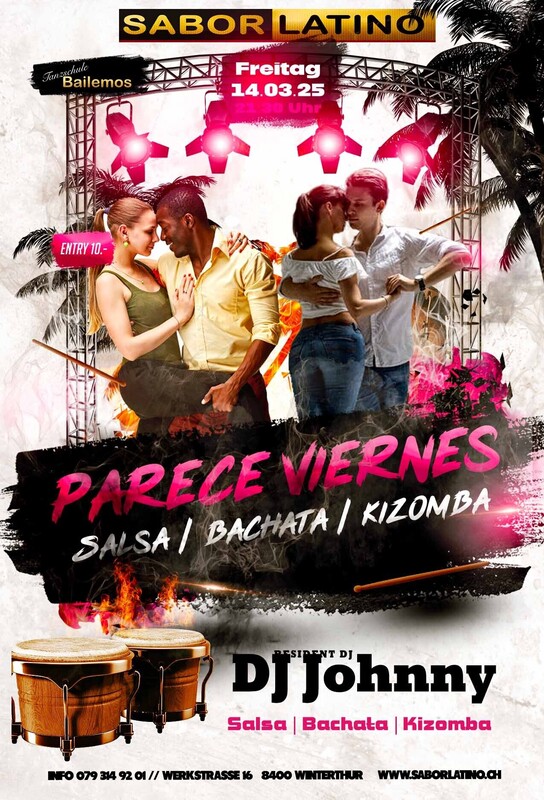 Die richtige Party, um das Wochenende zu beginnen. Mit wechselnden DJ`s immer Salsa, Bachata und Kizomba und auch mal Reggaeton. DJ Johnny: Salsa, Bachata, Kizomba Free Parking vor dem Club und mit dem ÖV ist das Sabor Latino einfach erreichbar bis Haltestelle Grüzenstrasse oder Brücke. Auch die Nachtbusse fahren im 1/2 Stundentakt an und ab diesen Haltestellen. Im Sabor Latino gibt es auch eine Tanzschule: www.bailemos.ch www.saborlatino.ch