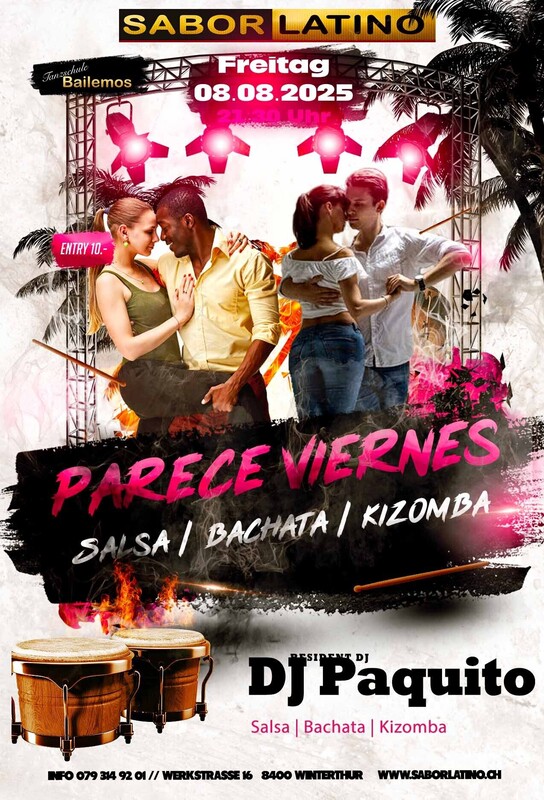 Die richtige Party, um das Wochenende zu beginnen. Mit wechselnden DJ`s immer Salsa, Bachata und Kizomba und auch mal Reggaeton. DJ Paquito: Salsa, Bachata, Kizomba Free Parking vor dem Club und mit dem ÖV ist das Sabor Latino einfach erreichbar bis Haltestelle Grüzenstrasse oder Brücke. Auch die Nachtbusse fahren im 1/2 Stundentakt an und ab diesen Haltestellen. Im Sabor Latino gibt es auch eine Tanzschule: www.bailemos.ch www.saborlatino.ch