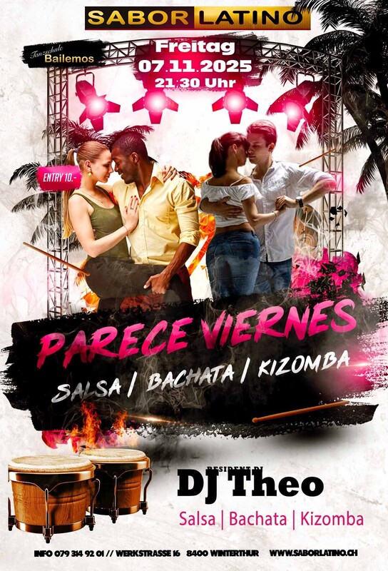 Die richtige Party, um das Wochenende zu beginnen. Mit wechselnden DJ`s immer Salsa, Bachata und Kizomba und auch mal Reggaeton. DJ Theo: Salsa, Bachata, Kizomba Free Parking vor dem Club und mit dem ÖV ist das Sabor Latino einfach erreichbar bis Haltestelle Grüzenstrasse oder Brücke. Auch die Nachtbusse fahren im 1/2 Stundentakt an und ab diesen Haltestellen. Im Sabor Latino gibt es auch eine Tanzschule: www.bailemos.ch www.saborlatino.ch