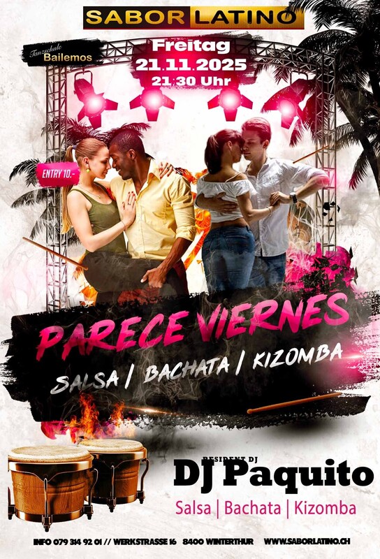 Die richtige Party, um das Wochenende zu beginnen. Mit wechselnden DJ`s immer Salsa, Bachata und Kizomba und auch mal Reggaeton. DJ Paquito: Salsa, Bachata, Kizomba Free Parking vor dem Club und mit dem ÖV ist das Sabor Latino einfach erreichbar bis Haltestelle Grüzenstrasse oder Brücke. Auch die Nachtbusse fahren im 1/2 Stundentakt an und ab diesen Haltestellen. Im Sabor Latino gibt es auch eine Tanzschule: www.bailemos.ch www.saborlatino.ch