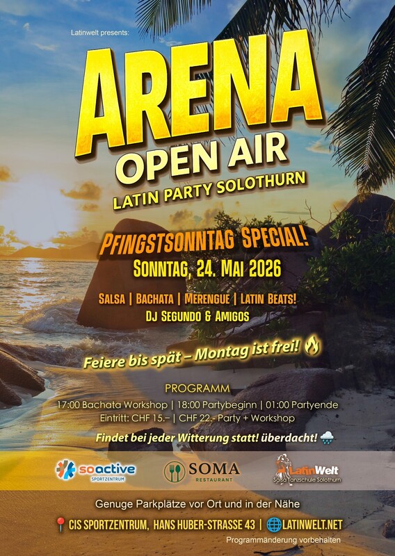 ARENA OPEN AIR – PFINGSTSONNTAG SPECIAL 🔥 Der perfekte Mix aus Sommer, Musik und Lebensfreude! Am Pfingstsonntag verwandelt sich Solothurn in eine Latin-Oase mit heissen Rhythmen, guter Laune und unvergesslichen Momenten. Schnapp dir deine Freunde und erlebe echtes Open-Air-Feeling – tanzen, feiern und geniessen unter freiem Himmel! 💃 Montag ist frei – also feiere mit uns bis spät in die Nacht! 📅 Sonntag, 24. Mai 2026 📍 CIS Sportzentrum, Hans Huber-Strasse 43, Solothurn 💃 Salsa | Bachata | Merengue 🕺 Tanzfläche unter freiem Himmel 🎧 Latin Beats mit DJ Segundo & Amigos 🕒 PROGRAMM 17:00 Bachata Workshop 18:00 Partybeginn 01:00 Partyende 💸 Eintritt: CHF 15.– Party | CHF 22.- Party + Workshop ☔ Findet bei jeder Witterung statt 🏠 Bei kühlem Wetter findet die Party im CIS (Indoor) Sportzentrum Solothurn statt 🚗 Genügend Parkplätze vor Ort und in der Nähe 🔥 Der Latin Sommer in Solothurn geht in die nächste Runde! 👉 Markiere deine Freunde & sei dabei! https://www.latinwelt.net/p/pfingstsonntag-special.html