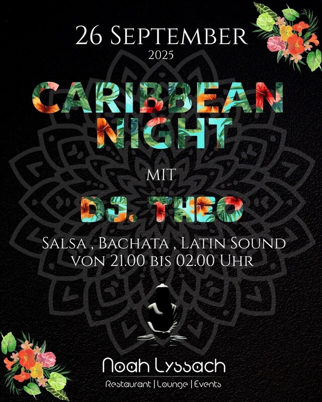 "Premiere" FREITAG 26. SEPTEMBER NOAH CARIBBEAN NIGHT Salsa Bachata & Latin Hits mit DJ Theo 21h - 02h. I Eintritt Frei NOAH I Sushi / Steakhouse Kernenriedstrasse 1/4th floor, 3421 Lyssach (BE) www.noahlyssach.ch Warme Küche 18:00 Uhr bis 22:00 Uhr Viele Gratis Parkplätze vorhanden https://fb.me/e/5mtudcaMP