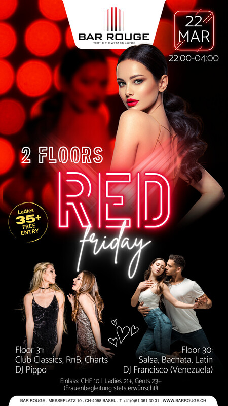 Geniesse die ultimative Party auf 2 Floors! Schwinge im 30. Stock deine Hüften zu heissem, leidenschaftlichem und mitreissendem Salsa & Latin! Tanze mit uns durch die Nacht bis es hell wird. Join the club! Music: _Floor 30: Salsa, Bachata, Latin _Floor 31: Club Classics, RnB, Charts https://www.barrouge.ch/de/events/redfriday22032024/