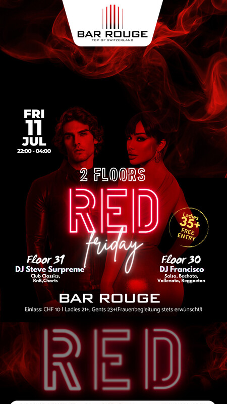 Flirten, feiern, Cocktails geniessen und im Lichtermeer der Nacht versinken. Join the party! Music: _Floor 30: Salsa, Bachata & Latin _Floor 31: Club Classics, RnB, Charts https://www.barrouge.ch/de/events/RedFriday11072025/