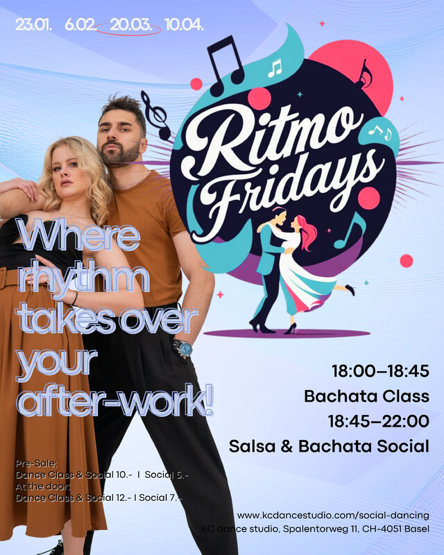 Join our Ritmo Fridays with a Dance Class and Salsa & Bachata Social at KC dance studio in Basel. Learn a fun new move and practice it at our Social. Schedule: 18:00–18:45 Dance Class 18:45–22:00 Social Pre-Sale: Dance Class & Social: 10.- Social only: 5.- At the door: Dance Class & Social: 12.- Social only: 7.- Everyone’s welcome – bring your friends and let the rhythm take over after work! 💃🕺 https://kcdancestudio.com/social-dancing/