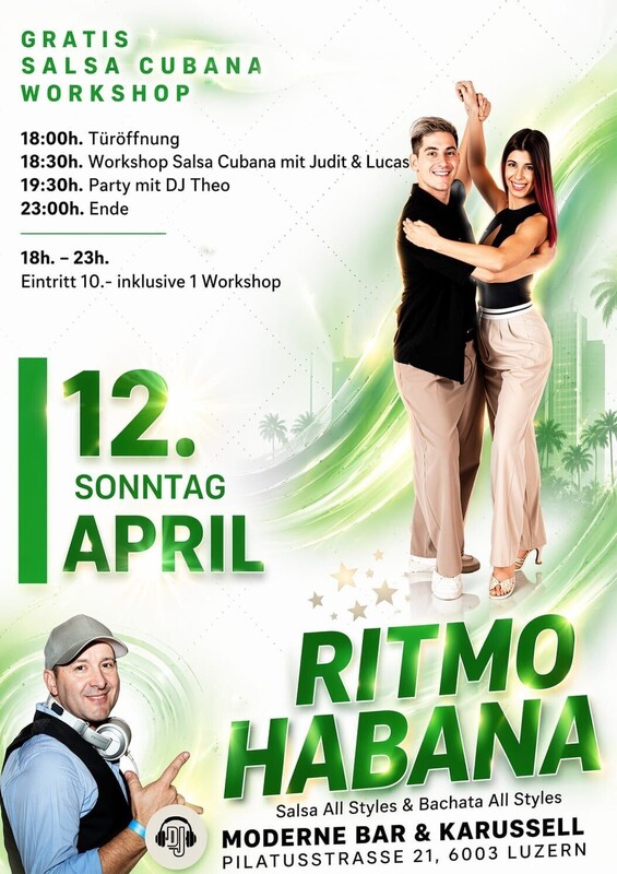 im Zentrum von Luzern ★ JEDEN SONNTAG ★ 18:00 Uhr bis 23:00 Uhr ★ RITMO HABANA ★ Salsa Cubana & Salsa Puertoriqueña, Bachata all Styles, Son & Cha Cha mit DJ Theo -------------------------------------------------------- PROGRAMM: > 18:00 Uhr Türöffnung und Musik mit DJ Mingo > 18:30 Uhr Workshops Salsa Cubana mit Judit & Lucas > 19:30 Uhr Party mit DJ Mingo & DJ Theo > 23:00 Uhr Party Ende --------------------------------------------------------- 18.00 Uhr bis 23.00 Uhr Eintritt 10.- (NUR BARZAHLUNG) Im MODERNE trifft man sich an der Bar oder im Karussell im ehemaligen Kinosaal. MODERNE BAR & KARUSSELL Pilatusstrasse 21, 6003 Luzern, www.modernekarussell.ch ---------------------------------------------------------- WIE FINDEN SIE UNS: ------------------------- AUTO: Parkhaus Kantonalbank, 100 Meter Bahnhofparking P1+P2, 200 Meter BUS: Buslinie Nr. 1 ab Bahnhof Luzern - Kantonalbank (1 Station) ZUG: 200 Meter, vier Gehminuten ab Hauptbahnhof Luzern