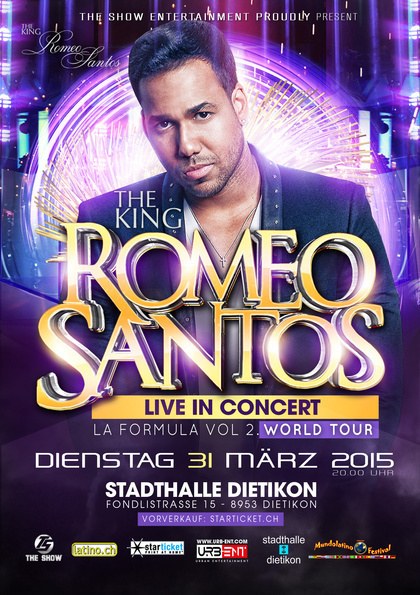▬▬▬▬▬▬▬▬▬ ☆ TICKET FEE ☆ ▬▬▬▬▬▬▬▬▬▬ NORMAL TICKET: 109.- AGOTADO! EARLY ENTRY TICKET: 129.- Fast Entry 6pm only with this ticket VIP BALKON TICKET: 149.- AGOTADO! GOLDEN CIRCLE TICKET: 299.- Best view on the stage (Balkon), Welcome drink, Fingerfood VIP MEET & GREET TICKET: 899.- VIP Balkon : Best view on the stage, Welcome drink, Fingerfood, Meet & Greet with Romeo Santos ▬▬▬▬▬▬▬▬▬ ☆ PRE-SALES ☆ ▬▬▬▬▬▬▬▬▬▬ Ticket Aviable at TICKETS@THESHOW-ENT.CH Please send us mail with -How much Tickets -Name, Adresse, Email Starticket (Exkl Gebühren) ***** LatinoCard Entrada 19h: CHF 99.00 Entrada 18h: CHF 119.00 Balcón: CHF 139.00 Tickets adquiribles solamente por email: TICKETS@THESHOW-ENT.CH Un ticket por LatinoCard Por favor enviar: - Nombre, Dirección, Email - Nr. de LatinoCard ▬▬▬▬▬▬▬▬▬ ☆ INFOS ☆ ▬▬▬▬▬▬▬▬▬▬ Bajo el nombre de Romeo Santos se encuentra Anthony Santos, un cantautor de Nueva York que desde muy joven se dedicó al mundo de la música siendo el vocalista del grupo Aventura, con el que empezó a tener una fama dentro del mundo musical latino. Tras abandonar el grupo en 2011, El ex-vocalista comienza su carrera en solitario con una gira mundial presentando su primer disco: ‘Formula, Vol. 1′, un álbum compuesto de 15 temas y que cuenta con las colaboraciones de Lil Wayne, La Mala Rodríguez, Tomatito, Mario Domm y Usher. Su primer single ‘You’ consiguió ser número 1 en el Hot Latin Songs y Tropical Songs. El Rey de la bachata, Romeo Santos, estará en marzo de 2015 en Zürich presentando “Romeo Santos Vol. II”. http://www.theshow-ent.ch/