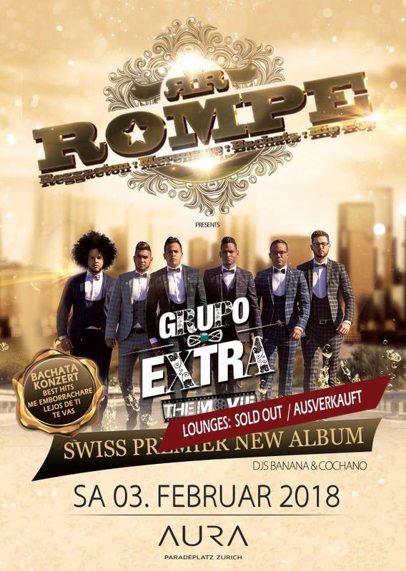 GRUPO EXTRA LIVE @ ♛ ROMPE♛ AURA CLUB ♛♛♛ FOR LOUNGES // Telf. 079 344 50 92 // juan@juanesevents.ch ♛♛♛ ROMPE das Aushängeschild aller Zürcher Latino Partys präsentiert euch heute ein exklusives Konzert mit der bekannten und angesagten Band ( Grupo EXTRA ) die ihre neuesten Lieder und das brandaktuelle Album THE MOVIE Performen wird. Die letzte Präsentation der Grupo Extra 2016 am Zürifest, hinterliess eine unvergessliche Choreographie, pures Adrenalin und eine Show die einem den Atem beraubte. Mit diesen Referenzen sind wir uns sicher dass ROMPE uns einen unvergesslichen Abend mit viel Reggaeton, Bachata, Merengue und Liebe bescheren wird. ♛♛♛ KONZERT VON GRUPO EXTRA UM 01:00 UHR UND DAUER 70 MIN. nach dem Konzert Reggaeton party mit DJ Banana & Cochano till end... ♛♛♛ Djs BANANA & COCHANO Reggaeton – Merengue – Bachata - Hip Hop - Partytunes *** Ab 18 Jahren // Doors ab 23:00 Uhr CHF 30.- *** Da heute ein Konzert in Rompe stattfindet, gibts nur Friendsliste. Danke für das Verständnis *** Achtung: für die nächste ROMPE haben wir 3 Eingänge bereit um den Eintritt schneller zu gewährleisten. ♛.Eingang 1: Lounge Reservationen & GOLD CARD ♛.Eingang 2: Gästeliste & Freetickets ♛.Eingang 3: Nur Abendkasse ♛♛♛ **** Bienvenidos / Willkommen. Juanes Events www.juanesevents.ch