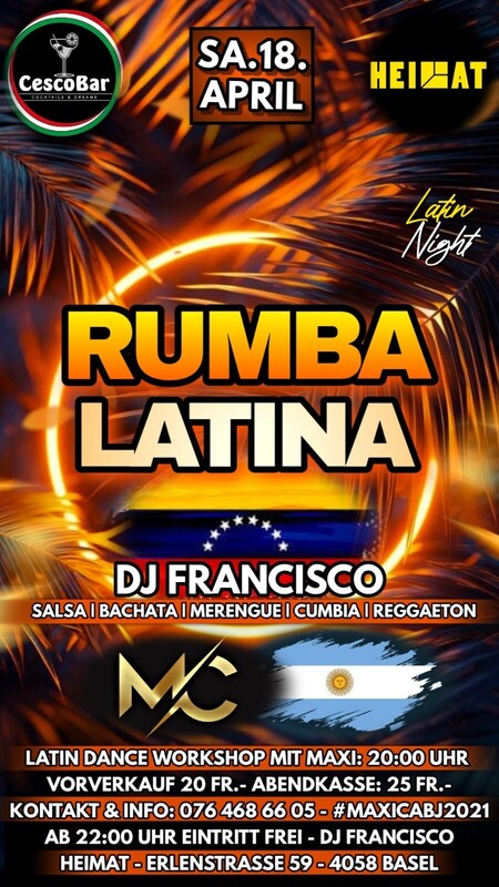 HEIMAT CLUB presenta: NOCHE DE RUMBA 🇦🇷🇦🇷🇦🇷🇦🇷🇦🇷🇦🇷🇦🇷🇦🇷🇦🇷🇦🇷🇦🇷🇦🇷🇦🇷 A partir de las 20:00, MAX encenderá la pista con su Workshop de Zumba (Latin Mix). 🇩🇴🇩🇴🇩🇴🇩🇴🇩🇴🇩🇴🇩🇴🇩🇴🇩🇴🇩🇴🇩🇴 TIENE HAMBRE? TENDRÁ COMIDA DOMINICANA YAMILET deleitará a nuestros invitados con sus platillos. MENÚ: Arroz con maíz, pollo al horno y ensalada rusa 15.- EMPANADAS: Jamón y queso 5.- Con pollo 5.- 🇻🇪🇻🇪🇻🇪🇻🇪🇻🇪🇻🇪🇻🇪🇻🇪🇻🇪🇻🇪🇻🇪🇻🇪🇻🇪 A partir de las 22:00, DJ Francisco pondrá la pista de baile con los mejores éxitos de salsa, merengue, bachata, cumbia y reguetón. ¡Disfruta del mejor ambiente latino que hayas visto en Basilea! Reúne a tus amigos y ven a divertirte 🇩🇪🇩🇪🇩🇪🇩🇪🇩🇪🇩🇪🇩🇪🇩🇪🇩🇪🇩🇪🇩🇪🇩🇪🇩🇪 HEIMAT CLUB präsentiert: RUMBA NIGHT 🇦🇷🇦🇷🇦🇷🇦🇷🇦🇷🇦🇷🇦🇷🇦🇷🇦🇷🇦🇷🇦🇷🇦🇷🇦🇷🇦🇷 Ab 20:00 Uhr heizt MAX die Tanzfläche mit seinem Zumba-Workshop (Latin Mix) ordentlich ein. 🇩🇴🇩🇴🇩🇴🇩🇴🇩🇴🇩🇴🇩🇴🇩🇴🇩🇴🇩🇴🇩🇴 Hungrig? YAMILET verwöhnt seine Gäste mit dominikanischen Spezialitäten. MENÙ: Reis mit Mais, gebackenem Hähnchen und russischem Salat 15.- EMPANADAS: Schinken und Käse 5.- Hähnchen 5.- 🇻🇪🇻🇪🇻🇪🇻🇪🇻🇪🇻🇪🇻🇪🇻🇪🇻🇪🇻🇪🇻🇪🇻🇪🇻🇪 Ab 22:00 Uhr legt DJ Francisco die besten Salsa-, Merengue-, Bachata-, Cumbia- und Reggaeton-Hits auf. Erlebe die beste Latin-Atmosphäre, die du je in Basel gesehen hast! Trommel deine Freunde zusammen und kommt vorbei!