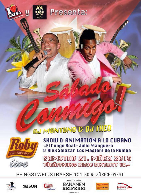 Jeden 3. Samstag vom Monat im Bananenreiferei Event Location Zürich Ein Salsa Event präsentiert von I Love Salsa Switzerland & CUC ★ SABADO CONMIGO ★ SAMSTAG 21. März 2015, Ab 21:00 Uhr Live! ROBY Y SU MECANICA Premier Show & Animation a lo Cubano «El Congo Real» Julio Manguero & Alex Salazar Los Master de la Rumba Cubana SALSA CUBAN DANCE FLOOR DJ Theo - DJ Montuno ★ Salsa Cubana - Timba - Salsaton - Bachata - Cubaton - Latin ★ BANANENREIFEREI EVENT LOCATION Pfingstweidstrasse 101 · 2 Stock · 8005 Zürich-West Infos & Lounge Reservation: theo.terzis@ilovesalsa.ch / Tel: 076 390 09 54 Eintritt nur 15.- CHF Genügend Parkplätze! Powered by www.vivacaribe.ch