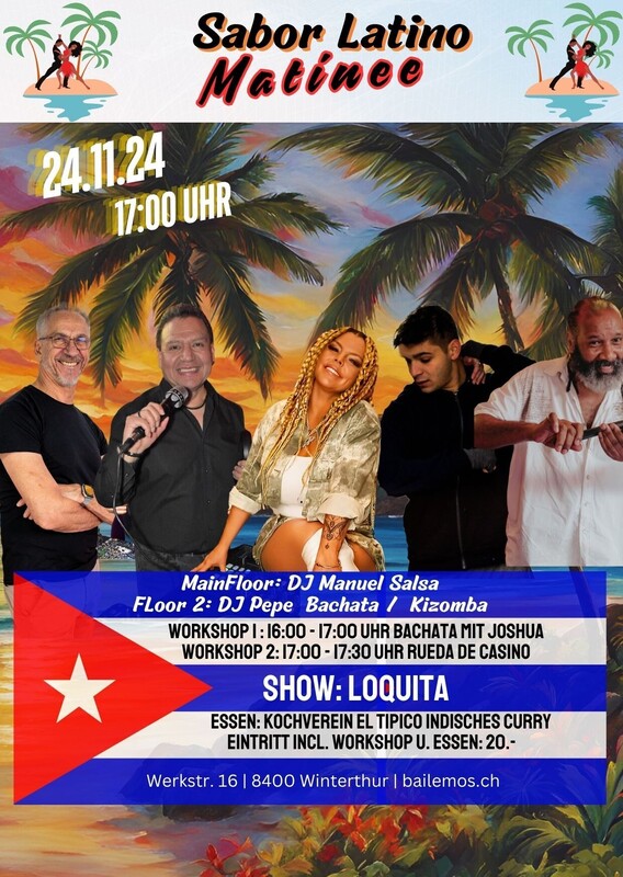 SABOR LATINO MATINEE, seit über 10 Jahren die Party am Sonntagnachmittag für alle die Salsa, Bachata und Kizomba lieben. Hast du Lust auf eine Salsa, Bachata und Kizomba-Party, die dich zum Schwitzen bringt? Dann komm zum Sabor Latino Matinee! Hier gibt es nicht nur einen, sondern gleich zwei Dancefloors, auf denen du zu den heißen Rhythmen unserer DJ`s das Tanzbein schwingen kannst. Aber bevor du dich in das Party-Getümmel stürzt, hast du die Möglichkeit, bei einem Workshop deine Tanz-Skills zu verbessern. Unsere professionellen Tanzlehrer werden dir zeigen, wie du dich elegant auf dem Parkett bewegst und dabei eine Menge Spaß hast. Danach darfst du dein Können beim Rueda ausprobieren und dein Glück beim Tanzen in der Gruppe versuchen. Und wenn du zwischendurch eine Pause brauchst, kannst du Dir an der Bar einen feinen Cocktail gönnen und um 18:30 Uhr von den köstlichen Düften eines feinen Menus von unserem Kochverein el Tipico verführen lassen. Also komm vorbei und verbringe eine unvergessliche Zeit mit uns auf der Sabor Latino Matinee! Floor 1 DJ Manuel mit Salsa Floor 2 DJ Pepe Bachata | Kizomba Liveact: Loquita Essen: Kochverein El Tipico: Indisches Curry 2 Workshops: 16:00 – 17:00 Uhr Bachata Workshop mit Joshua & Partnerin 17:00 – 17:30 Uhr Rueda mit Franz Vor dem Sabor Latino stehen genügend gratis Parkplätze zur Verfügung. Anreise mit dem Auto: Wegbeschreibung: An – Abreise mit dem ÖV bis Werkstr. 16: Zum Fahrplan https://saborlatino.ch/events/sabor-latino-matinee-am-sonntagnachmittag/