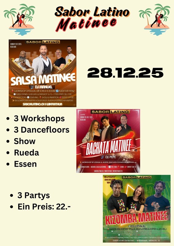 💃 Sabor Latino Matinee 16:00 – 22:00 Uhr Seit über 10 Jahren die Sonntags-Party für alle, die Salsa, Bachata & Kizomba lieben! Schon um 16:15 bis 17:00 Uhr starten unsere Workshops in Salsa, Bachata und Kizomba. Perfekt, um neue Schritte zu lernen und dich für die Party einzutanzen! Ab 17:00 Uhr heisst es dann: tanzen, feiern und geniessen auf gleich 3 Dancefloors – mit heissen Rhythmen, tollen Menschen und bester Stimmung. Geniesse zwischendurch einen Cocktail an der Bar und ab 19:30 Uhr ein feines Menü von unserem Kochverein El Típico. 👉 Erlebe einen Sonntag voller Tanz, Musik & Lebensfreude – beim Sabor Latino Matinee! Floor 1: DJ Manuel mit Salsa Floor 2: DJ Pepe Bachata Floor 3: DJ Paul Kizomba Show: Tanzschule bailemos Essen: El Tipico 4 Workshops: -16:15 – 17:00 Uhr: – Kizomba: Andrea & Paul – Bachata: Joshua & Alisiya – Salsa: Jorge el Bomba 17:00 – 17:30 Uhr Rueda Open Level mit Franz saborlatino.ch/events/matinee