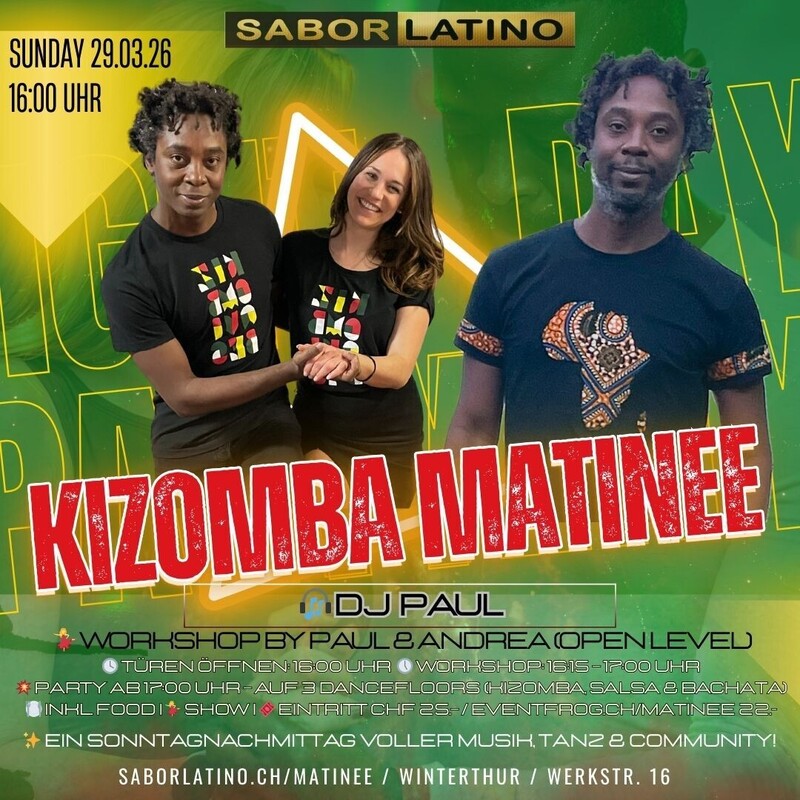 SABOR LATINO MATINEE Ein Sonntag wie ein Kurzurlaub in der Karibik: Das Sabor Latino Matinee vereint Salsa, Bachata & Kizomba zu einem einzigartigen Tanzerlebnis — alles an einem Nachmittag. 🔥 3 Dancefloors = 3 Partys gleichzeitig 💃 Salsa mit DJ Manuel ❤️ Bachata mit DJ Pepe ✨ Kizomba mit DJ Paul Dazu erwarten dich gleich 3 Workshops vor der Party: * Salsa mit Angela de la Caridad aus Kuba * Bachata mit Joshua & Alisiya (Schweizermeister) * Kizomba mit Paul & Andrea Und das ist noch längst nicht alles: 🎭 Rueda & Animation 💃 Bachata Show Andrea Cobos EL PAÑUELO Zürich Team 🍽️ Essen inklusive 🕺 große Tanzcommunity & Sonntags-Vibes 👉 Ein Ticket – ein Nachmittag – drei Tanzwelten. 16:00 Türen & Workshops ab 17:00 Party auf 3 Floors 🎟️ VVK CHF 22.– / Abendkasse 25.– 📍 Sabor Latino Club, Werkstrasse 16, Winterthur 👉 www.eventfrog.ch/Matinee ✨ Erlebe den beliebtesten Tanz-Sonntag der Region. Sabor Latino Matinee – wo sich die Tanzfamilie trifft. eventfrog.ch/matinee
