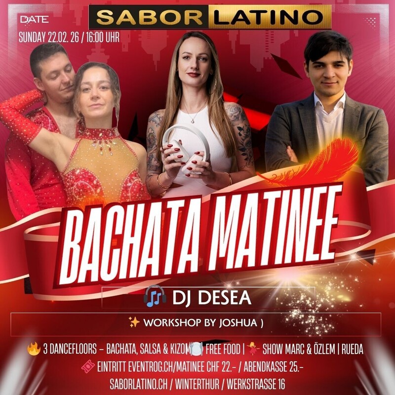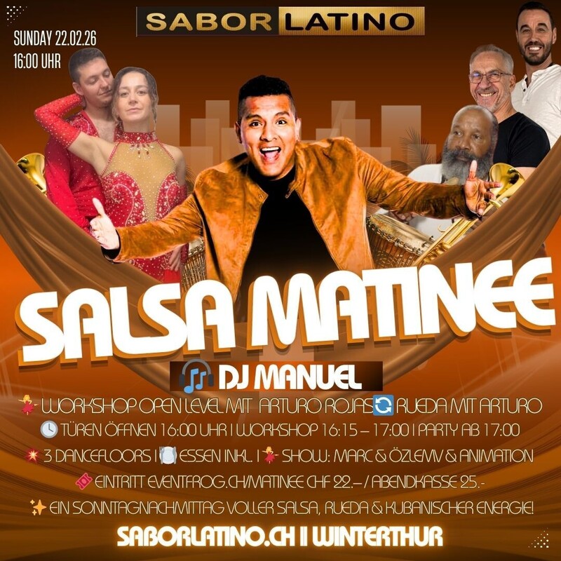 💃 Sabor Latino Matinee mit Anmeldung über Eventfrog.ch/matinee 16:00 – 22:00 Uhr Bitte meldet Euch über eventfrog.ch/matinee an. Ihr bekommt den Eintritt 3.- CHF günstiger und der Einlass zu den Workshops und der Party geht schneller. Seit über 10 Jahren die Sonntags-Party für alle, die Salsa, Bachata & Kizomba lieben! Schon um 16:15 bis 17:00 Uhr starten unsere Workshops in Salsa, Bachata und Kizomba. Perfekt, um neue Schritte zu lernen und dich für die Party einzutanzen! Ab 17:00 Uhr heisst es dann: tanzen, feiern und geniessen auf gleich 3 Dancefloors – mit heissen Rhythmen, tollen Menschen und bester Stimmung. Geniesse zwischendurch einen Cocktail an der Bar und ab 19:30 Uhr ein feines Menü von unserem Kochverein El Típico. 👉 Erlebe einen Sonntag voller Tanz, Musik & Lebensfreude – beim Sabor Latino Matinee! Floor 1: DJ Manuel mit Salsa Floor 2: DJ Desea Bachata Floor 3: DJ Paul Kizomba Show: Marc & Özlem Essen: El Tipico 4 Workshops: -16:15 – 17:00 Uhr: – Kizomba: Andrea & Paul – Bachata: Joshua & – Salsa: Arturo & Nina 17:00 – 17:30 Uhr Rueda Open Level mit Arturo saborlatino.ch/events/matinee https://eventfrog.ch/matinee