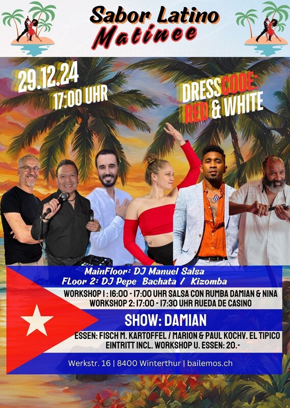 SABOR LATINO MATINEE, seit über 10 Jahren die Party am Sonntagnachmittag für alle die Salsa, Bachata und Kizomba lieben. Hast du Lust auf eine Salsa, Bachata und Kizomba-Party, die dich zum Schwitzen bringt? Dann komm zum Sabor Latino Matinee! Hier gibt es nicht nur einen, sondern gleich zwei Dancefloors, auf denen du zu den heißen Rhythmen unserer DJ`s das Tanzbein schwingen kannst. Aber bevor du dich in das Party-Getümmel stürzt, hast du die Möglichkeit, bei einem Workshop deine Tanz-Skills zu verbessern. Unsere professionellen Tanzlehrer werden dir zeigen, wie du dich elegant auf dem Parkett bewegst und dabei eine Menge Spaß hast. Danach darfst du dein Können beim Rueda ausprobieren und dein Glück beim Tanzen in der Gruppe versuchen. Und wenn du zwischendurch eine Pause brauchst, kannst du Dir an der Bar einen feinen Cocktail gönnen und um 18:30 Uhr von den köstlichen Düften eines feinen Menus von unserem Kochverein el Tipico verführen lassen. Also komm vorbei und verbringe eine unvergessliche Zeit mit uns auf der Sabor Latino Matinee! Dresscode: Red & White Floor 1 DJ Manuel mit Salsa Floor 2 DJ Pepe Bachata | Kizomba Liveact: Show Damian Essen: Kochverein El Tipico 2 Workshops: 16:00 – 17:00 Uhr Salsa con Rumba mit Damian & Nina 17:00 – 17:30 Uhr Rueda mit Franz Vor dem Sabor Latino stehen genügend gratis Parkplätze zur Verfügung. Anreise mit dem Auto: Wegbeschreibung: An – Abreise mit dem ÖV bis Werkstr. 16: Zum Fahrplan https://saborlatino.ch/events/sabor-latino-matinee-am-sonntagnachmittag/