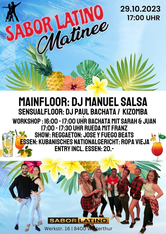 Sabor Latino Matinee, die besondere Party am Sonntag Nachmittag mit viel Erfolg. An dieser Party triffst Du tolle Menschen, auf 2 Dancefloors werden Bachata, Kizomba und natürlich Salsa gespielt. Eine Show ist jedes Mal Teil des Programms und zur Stärkung gibt es auch etwas zum Essen. Floor 1: DJ Manuel Salsa y mas Floor 2: DJ Paul Kizomba & Bachata Programm: Workshop 1:16:00 - 17:00 Uhr Bachata mit Juan Sarah Workshop 2: 17:00 - 17:30 Uhr Rueda mit Franz 19:00 Uhr: Show: Reggaeton by Jose 19 :30 Uhr: Essen: Ropa Vieja (kubanisches Nationalgericht) Eintritt inkl. Garderobe, Workshops und Essen: 20.- https://saborlatino.ch/event/sabor-latino-matinee