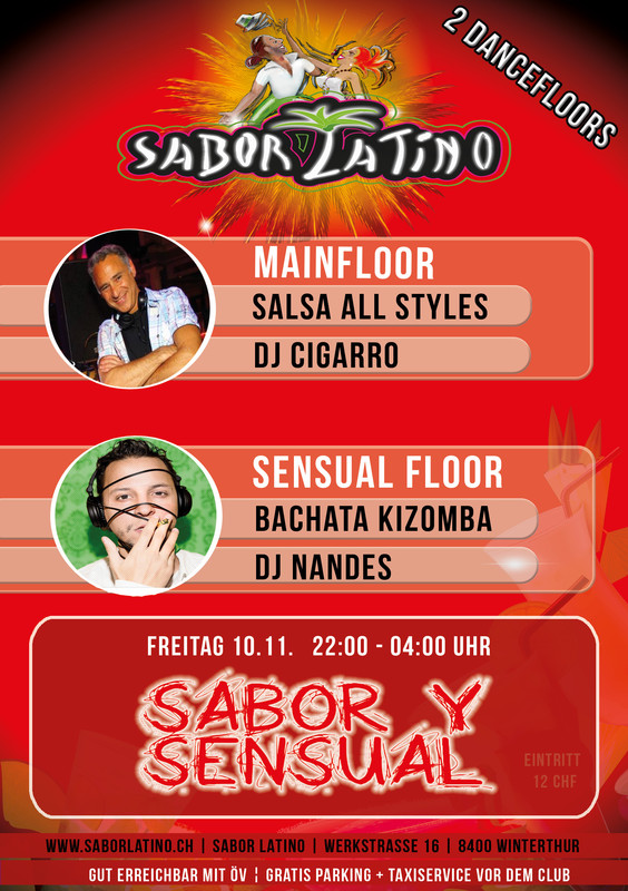 Salsa / Bachata / Kizomba auf 2 Dancefloors, feinste Cocktails, gutes Ambiente und mega Stimmung. Mainfloor: DJ Cigarro Salsa all Styles Sensual Floor: DJ Nandes Bachata // Kizomba DJ: Rafy www.saborlatino.ch Vor dem Club gibt es jede Menge Gratis Parkplätze und es wartet auch ein Taxi. Das Sabor Latino ist mit den ÖV gut erreichbar. Mit Linie 1 bis Brücke oder den Linien 3;5 und 14 bis Haltestelle Grüzenstrasse. Mit den S-Bahnen bis Bahnhof Grüze. Von da sind es auch nur 5 Gehminuten.