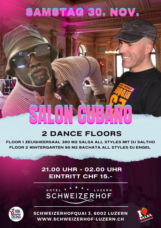 Salon Cubano SAMSTAG 30. NOVEMBER 2024 Herzlich Willkommen im Legendäre "SALON CUBANO " des 5-Sterne-Hotels Schweizerhof Luzern. Salsa & Bachata auf 2 Tanz-Parquett Dance Floors SALSA FLOOR (360 m2): Salsa All Styles mit DJ Saltho BACHATA FLOOR (95 m2): Bachata All Styles DJ Engel SUPPORT BY: - Tanzschule Salsabrosa Luzern - Tanzschule Salsa y Mas Luzern - Tanzschule Bachata Flow Luzern - Tanzschule Salsa Emotion Luzern - Dance Academy WannDance Luzern 21:00 Uhr bis 02:00 Uhr Eintritt CHF 15.- (NUR BARGELD) --------------------------------------------------------- ZEUGHEERSAAL: --------------------- Salsa Floor mit DJ Saltho Der prächtige Festsaal ist unser Juwel. Der im Jahr 1865 erbaute Ballsaal ist ideal für Grossanlässe mit bis zu 500 Personen und 360 m2 Tanz-Parkett. WINTERGARTEN: -------------------- Bachata Floor mit DJ Engel Mit seinem kunstvollen Glasgemälde an der Decke ist besonders beliebt für Kleinanlässe mit bis 95 m2 Tanz-Parquett. ------------------------------------------------------------------ DAS 5 STERNE HOTEL SCHWEIZERHOF LUZERN liegt direkt am Vierwaldstättersee und in unmittelbarer Nähe zum Stadtzentrum von Luzern. ------------------------------------------------------------------ HOTEL SCHWEIZERHOF LUZERN Schweizerhofquai 3, 6002 Luzern www.schweizerhof-luzern.ch Viele Parkplätze Möglichkeiten in der Nähe: www.parking-luzern.ch https://fb.me/e/gchhDIDCY