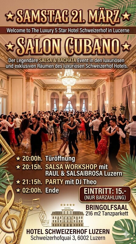 ★ SAMSTAG 21. MÄRZ 2026 ★ Welcome to The Luxury 5 Star Hotel Schweizerhof in Lucerne ★ SALON CUBANO ★ Der Legendäre SALSA & BACHATA Event in den luxuriösen und exklusiven Räumen des luxuriösen Schweizerhof Hotels. ★ 20:00h. Türöffnung ★ 20:15h. SALSA WORKSHOP mit RAUL & SAYRA (Salsabrosa Luzern) ★ 21:15h. PARTY mit DJ Theo ★ 02:00h. Ende ★ EINTRITT: 15.- (NUR BARZAHLUNG) Salsa All Styles & Bachata All Styles ------------------------------------------------------ ★ BRINGOLFSAAL > Salsa & Bachata Floor mit DJ THEO 1887 erbaut vom «Hofarchitekten» Arnold Bringolf-Hauser, eignet sich der prächtige Bringolfsaal für verschiedenste Veranstaltungen. Der Saal liegt Tür an Tür mit unserer Brasserie VICO sowie mit dem Zeugheersaal, Wintergarten und Goldroom. Dank dieser Kombination sind Festessen, Grossbankette und verschiedenste Veranstaltungen mit bis zu 800 Personen möglich. Im Bringolfsaal alleine finden 220 Leute Platz. Grösse: 216 m2 ------------------------------------------------------------------ DAS 5 STERNE HOTEL SCHWEIZERHOF LUZERN liegt direkt am Vierwaldstättersee und in unmittelbarer Nähe zum Stadtzentrum von Luzern. ------------------------------------------------------------------ Viele Parkplätze Möglichkeiten in der Nähe: www.parking-luzern.ch HOTEL SCHWEIZERHOF LUZERN Schweizerhofquai 3, 6002 Luzern www.schweizerhof-luzern.ch Facebook: https://fb.me/e/1UrUj8mUhe