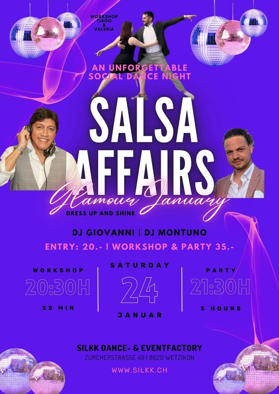 SALSA AFFAIRS - 24. Januar 2026 DRESS UP AND SHINE ist das Thema. Bringe deine elegante, edle, glitzernde und glamuröse Seite zum Vorschein. Geniesse in der eleganten Location Silkk mit den zwei top DJ's DJ Giovanni & DJ Montuno die besten Social Dances die du dir wünschen kannst! Unser Label SALSA AFFAIRS bietet dir in einmaliger Atmosphäre alles was das Social Dance Herz begehrt. Als Warm Up findet vor der Party ein Workshop statt und danach ist tanzen, tanzen, tanzen zu feinstem Salsa und Bachata von DJ Montuno und weiteren bekannten nationalen und internationalen Top DJ's angesagt. Wir freuen uns auf euch! ____________________________________ PREIS Entry: 20.- Entry & Workshop: 35.- PROGRAMM Workshop Time: 20:30- 21:25 Social Dancing: 21:30- 02:30 WORKSHOP INFOS Art: Salsa Partnerwork Workshop Teacher: Tiago & Valeria Beschreibung: Tiago & Valeria bringen eine tolle Salsa Linea Kombination mit. Die wertvollen Inputs die du erhältst, kannst du in deinem Salsa Social Dance integrieren und an der anschliessenden Salsa Allstyle Party direkt umsetzen. MUSIC Salsa und Bachata mit DJ GIOVANNI & DJ MONTUNO NEXT SALSA AFFAIRS 2026 30. Mai 29. August 12. Dezember - JUBILÄUMS EDITION _________________________________________ SALSA SUNDAY DATES 2026 1. Februar 1. März 12. April - ausnahmsweise 2. Sonntag im Monat 3. Mai 7. Juni 5. Juli 2. August 6. September 4. Oktober 1. November 6. Dezember https://www.silkk.ch/events/Salsa-Affairs-236-503