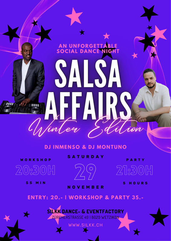 WINTER EDITION - Mit DJ INMENSO & DJ MONTUNO Elegante Location, zwei top DJ's und die besten Social Dances die du dir wünschen kannst! Unser Label SALSA AFFAIRS bietet dir in einmaliger Atmosphäre alles was das Social Dance Herz begehrt. Als Warm Up findet vor der Party ein Workshop statt und danach ist tanzen, tanzen, tanzen zu feinstem Salsa und Bachata von DJ Montuno und weiteren bekannten nationalen und internationalen Top DJ's angesagt. Wir freuen uns auf euch! ____________________________________ PREIS Entry: 20.- Entry & Workshop: 35.- PROGRAMM Workshop Time: 20:30- 21:25 Social Dancing: 21:30- 02:30 WORKSHOP INFOS Art: "A Contratiempo" Teacher: Giuseppe von Sodastudio Beschreibung: Tauche mit Giuseppe in die Welt des "A Contratiempo" ein. Rhythmus Wechsel verstehen erweitert deine Möglichkeiten im Social Dance und bringt dir puren Genuss auf der Tanzfläche. MUSIC Salsa und Bachata mit DJ INMENSO & DJ MONTUNO NEXT SALSA SUNDAYS 7. Dezember - JUBILÄUMS EDITION - SAVE THE DATE! SALSA AFFAIRS 2026 Samstag 24. Januar Samstag 30. Mai Samstag 28. August Samstag 12. Juni - Jubiläums-Edition https://www.silkk.ch/events/Salsa-Affairs-236