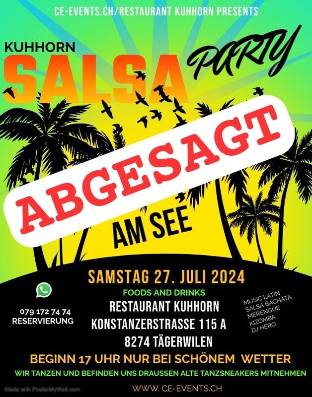 Abgesagt !!! Lasst uns abtanzen und das Leben feiern am Samstag den 27. Juli im Rest. Kuhhorn in Tägerwilen am See !! Findet nur bei schönem Wetter statt. Wir Tanzen und befinden uns draussen alte Tanz Sneakers mitnehmen !!! Party ab 17 Uhr bis 22 Uhr mit DJ Hero Infos: Phone 078 209 93 31 oder per Mail an info@ce-events.ch Wir freuen uns auf einen schönen Abend mit Euch! CE-EVENTS.CH