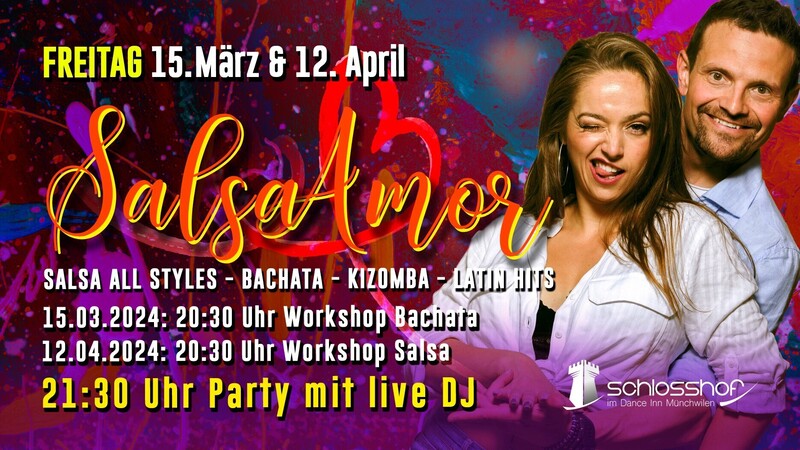 Vamos a Bailar! Esssoooooo.... :) Tanzen ist Liebe, Salsa ist Leidenschaft und ein Lebensgefühl zugleich darum gibt's keinen besseren Namen als SALSA AMOR Die Party wird präsentiert vom CH-Meister Paar Céline & Adrian. Willkommen zu unserer Salsa Party im Schlosshof Münchwilen. 20:30 Bachata Workshop by Céline & Adrian 21:30 Start Party mit DJ Juanqui Im Dance Inn findet die beliebte Shake It Up Party statt. Mit dem Eintritt habt ihr Zugang zu beiden Veranstaltungen. Wir freuen uns auf Euch. https://www.danceinn.ch/Events/SalsaAmor2024-586