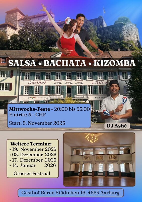 Wir laden euch ein, zu tanzen und bekannte Rhythmen zu genießen . Salsa und Bachata . Dj Ashé Hothel Bären im Aarburg. Wir freuen uns auf euch. https://www.facebook.com/pavelmichell