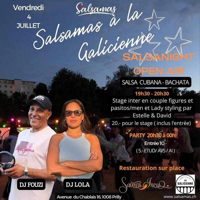 Soirée Salsa Cubana & Bachata sous les étoiles avec Salsamas 2025 à La Galicienne ! Quel plaisir de vous retrouver sur la piste, sous les étoiles ! Rendez-vous les vendredis, à La Galicienne pour une ambiance caliente ! 19h30 à 20h30 : Stage intermédiaire Salsa en couple figures et pasitos avec Estelle et David 20.- pour le cours (inclus l'entrée) 20h30 à 00h00 : Dj Lola et DJ Fouzi aux platines (et d'autres DJs à venir) Salsa & Bachata au rendez-vous ! ★ Entree : 10.- (5.- pour étudiant-es / AVS / Al) Dégustation sur place des empanadas et salades ( parking gratuit collé à la Galicienne) Plus d'infos : www.salsamas.ch https://salsamas.ch/%C3%A9v%C3%A8nements#db9de8d5-7aa5-4110-9cc8-80fa05026d81