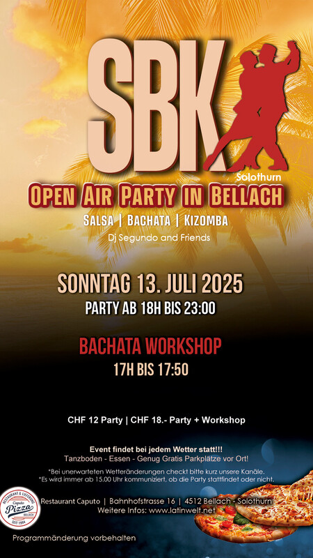 ⚠️ Der Event findet bei jedem Wetter statt. 👈🏽 Latinwelt präsentieren: ★SALSA, BACHATA, KIZOMBA OPEN AIR PARTY IN BELLACH Workshop | Tanzfläche! Dj Segundo & Friends ★Zeit Sonntag: 17:00 - 17:50 Uhr | Workshop 18:00 - 23.00 Uhr Party ★Preis: CHF 12.- Eintritt Party CHF 18.- Workshop + Eintritt Party CHF 10.- Nur Workshop ★Informationen: - Tanzboden - Essen: Pizza, Pasta, Grill... - Restaurant offen ab 17h - Der Event findet bei jedem Wetter statt. - 15 Minuten zu Fuss vom bahnhof Bellach - 5 Minuten mit dem Auto von Solothurn - genug Parkplätze vor Ort weitere Informationen unter www.latinwelt.net Anmeldung nicht zwingend.