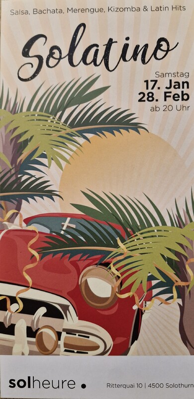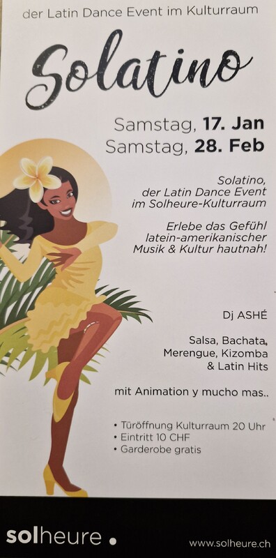 SOLATINO Der Latin Dance Event im Solheure - Kulturraum Erlebe das Gefühl Latein- amerikanischer Musik & Kultur hautnach! Wir laden euch ein, zu tanzen und bekannte Rhythmen zu genießen. Salsa. Bachata. Kizomba. Dj Ashé. Wir freuen uns auf euch. https://www.facebook.com/pavelmichell