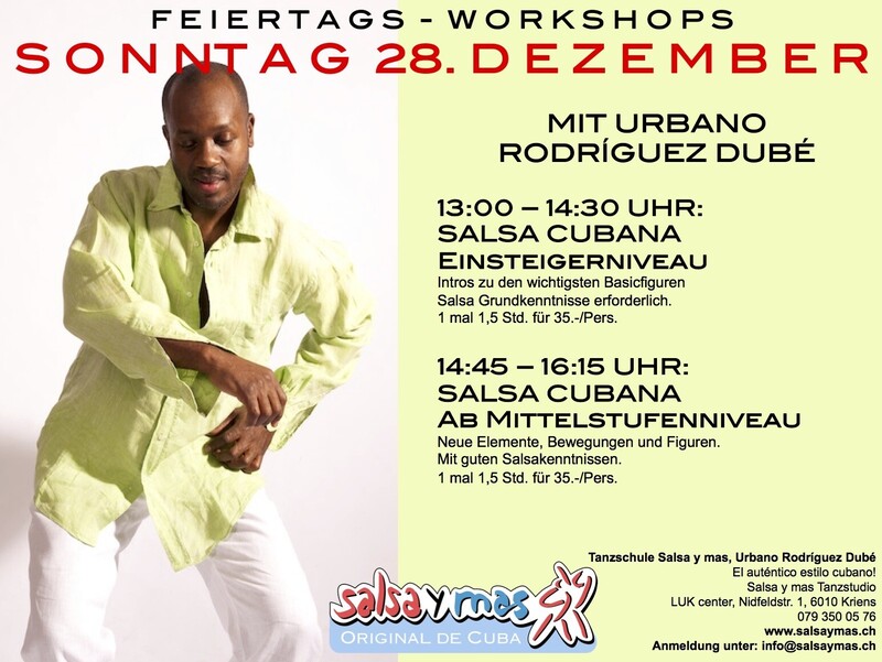 Wir freuen uns sehr, einen tollen Workshop-Tag mit Urbano Rodriguez Dubé anbieten zu können! Anstelle den Feiertag auf dem Sofa zu verbringen, komm mit auf die Tanzpiste! Lasst euch ihm in die reiche Welt des kubanischen Tanzes entführen und begleiten. Wir freuen uns darauf! SONNTAG, 28. Dezember 2025 13:00 – 14:30 Uhr: Salsa Cubana - im Einsteigerniveau Übe die Intros zu den wichtigsten Basicfiguren der kubanischen Salsa. Grundkenntnisse in Salsa nötig. 1 mal 90 min. für CHF 35.- 14:45 – 16:15 Uhr: Salsa Cubana - ab Mittelstufenniveau Neue Elemente, Bewegungen und Figuren. Mit guten Salsakenntnissen. 1 mal 90 min. für CHF 35.- Kurslokal: Salsa y mas Tanzstudio, LUK Center, Nidfeldstrasse 1, 6010 Kriens (an der Stadtgrenze Luzern) Anmeldung: Anmeldung bitte rasch unter info@salsaymas.ch Siehe auch www.salsaymas.ch für alle weiteren Kurse und Infos. Tanzschule Salsa y mas, Urbano Rodríguez Dubé Salsa y mas Tanzstudio LUK Center, Nidfeldstrasse 1 6010 Kriens (Luzern) Tel: 079 350 05 76 / 078 861 54 11 info@salsaymas.ch www.salsaymas.ch Jedes Jahr Tanzreisen nach Kuba! „…para que conozcas a Cuba!“ www.salsaymas.ch