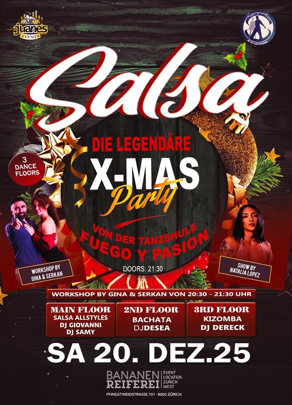 FUEGO Y PASION & JUANES Present: ★ DIE LEGENDARE ★ X-MAS ★ PARTY ★ 2025 VON FUEGO Y PASION 3 DANCE FLOORS ★★★ Samstag 20. DEZ. 2025 BANANENREIFEREI •••••• • DOORS: 21:30 – 04:00 UHR • EINTRITT PARTY CHF 20.- • EINTRITT: BEZAHLUNG AN DER KASSE NUR BARGELD. • GRATIS GARDEROBE • 400 AUTO PARKPLÄTZE ★★★ WORKSHOP BY GINA & SERKAN 20:30 bis 21:30 Uhr • Intermediate • Bachata Sensual • Preis: CHF 25.- Inkl Party 3 Floors. ★★★ SHOW BY NATALIA LOPEZ ★★★ ► MAIN FLOOR: SALSA ALL STYLES DJ SAMY & GIOVANNI Salsa Allstyles - Puertorriqueña - Cubana – Clasica - ChaChaCha •••• ► 2nd FLOOR: BACHATA DJ DESEA Bachata Fusion - Sensual - Moderna - Clasica y del Recuerdo •••• ► 3rd FLOOR: KIZOMBA DJ DERECK Kizomba - Semba - Tarraxinha - Afrohouse - Urban Kiz ★★★ BANANENREIFEREI Pfingstweidstrasse 101 8005 Zürich •••• Bienvenidos Juan & Beni •••• • WEB: www.salsafuegoypasion.ch • WEB: https://juanesevents.ch/ https://juanesevents.ch/