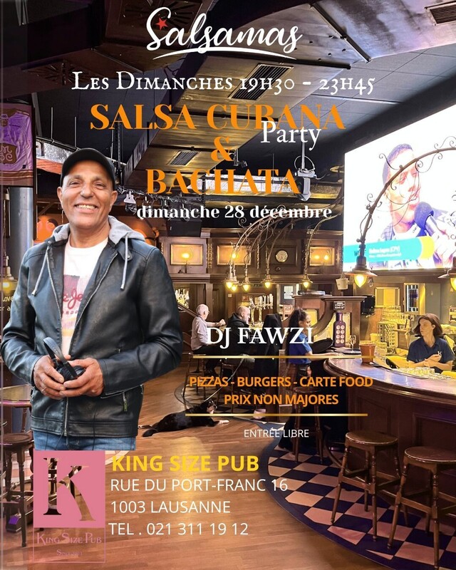 🔥 Le plus grand pub de Suisse romande ! 📍 Au cœur de Lausanne – Quartier du Flon ➡️ À côté du cinéma Pathé | En face du MAD 🍔 FOOD | 🍹 DRINK | 🎶 MUSIC | 🎉 PARTY ⸻ 💃 Soirée Salsa Cubana & Bachata 🎧 DJ Fawzi en live ! 📅 Tous les dimanches 🕗 19h30 – 23h45 📍 King Size Pub 📨 Rue du Port-Franc 16, 1003 Lausanne Entrée libre 📌 DJ susceptible de changer selon disponibilité ✨ Viens danser, boire, manger et partager de bonnes vibes ! Voir moins https://www.facebook.com/events/s/les-dimanches-au-king-size-ave/1231271685583527/ https://salsamas.ch/