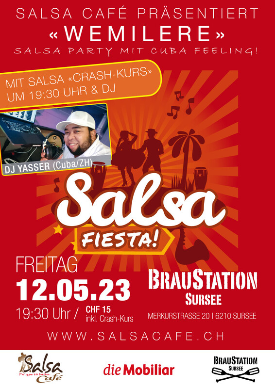 Am 12. Mai 2023 feiern wir unsere nächste Salsa Fiesta Wemilere in der Braustation Sursee. Um 19.30 Uhr starten wir mit einem Salsa Crash-Kurs. Für den richtigen Sound (Salsa All Styles - Bachata - Kizomba) ist DJ Yasser (Cuba/ZH) besorgt. Vamos a bailar! Wir freuen uns auf euch. https//:www.salsacafe.ch
