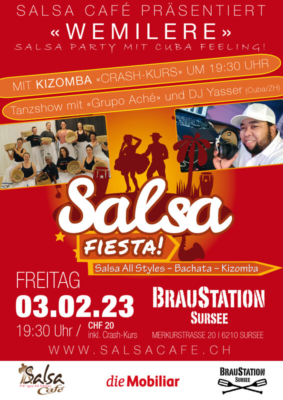 Am 3. Februar 2023 feiern wir die nächste Salsa Fiesta Wemilere in der Braustation Sursee. Wir starten um 19.30 Uhr mit einem Kizomba Einsteiger Crash-Kurs. Ein Highlight des Abends ist die Tanzshow von der "Grupo Aché". Für den richtigen Sound ist DJ Yasser aus Kuba/ZH besorgt. Kubanisches Feeling ist garantiert. Wir freuen uns auf dich. Vamos a bailar! https://salsacafe.ch