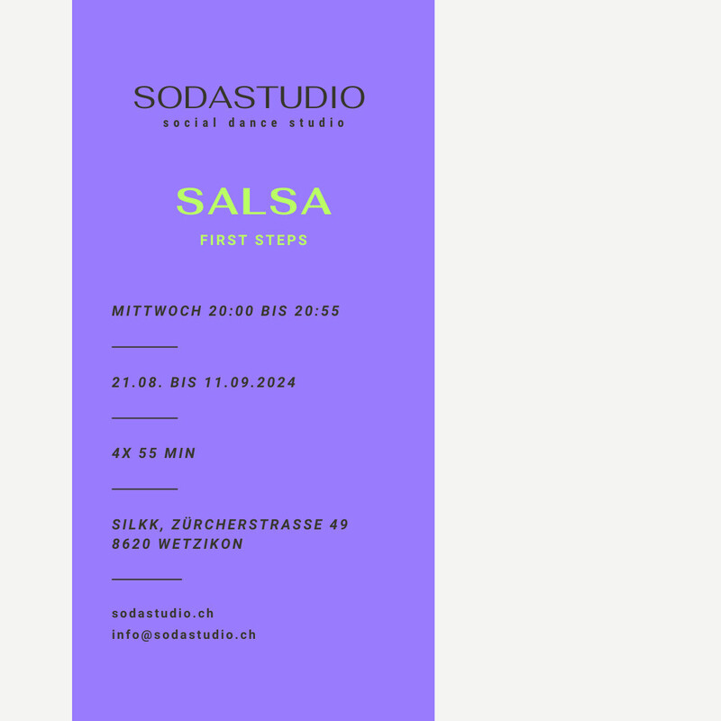 Starte deine Salsa Reise mit uns! Unsere Salsa First Steps Class richtet sich an Teilnehmer ohne Vorkenntnisse, an Wiedereinsteiger und an alle, die Interesse haben ihre Grundlagen asuzubauen und zu festigen. In 3 Lektionen lernst du die wichtigsten Grundlagen des Salsa, wir erklären dir den Aufbau von Salsa Musik und du lernst anhand von coolen Übungen die Rhythmik zu verstehen und mit deinem Körper umzusetzen. Lass dich von uns auf eine Reise voller Spass, Musikalität und Lebensfreude mitnehmen! Was du in diesem Kurs lernst: - Du lernst den Grundschritt und verschiedene Variationen des Grundschritts. - Wir schulen dein Taktgefühl und vermitteln dir erste Konzepte im Führen und Folgen. - Du lernst die wichtigsten Positionen und erste Figuren. - Du übst mit und ohne Partner (Anmeldung auch ohne Tanzpartner möglich). Kursdaten und Preis: MI 21. August bis MI 11. September 2024 | 20:00 - 20:55 4x 55 Min. | 120.-/Person Deine Tanzlehrer: Wir, Francesco und Mirjam von sodastudio, freuen uns darauf, dich auf deinem tänzerischen Weg zu begleiten und mit dir viele unterhaltsame und lehrreiche Stunden zu verbringen! Kontakt bei Fragen: Du kannst uns jederzeit über unser Kontaktformular auf sodastudio.ch oder per Mail info@sodastudio.ch kontakieren. https://www.silkk.ch/kurse/Salsa-Starter24-08-2024-19009-76