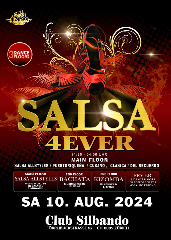 ✽ SALSA FOREVER ✽ ALL STYLES Pal Bailador, 3 Floors Club SILBANDO ● Samstag 10. August 2024 ● 3 Dance Floors ✽✽✽✽ SALSA 4EVER ist die Party für den guten Tänzer, eine Juanes-Party, die alle Stile anbietet, von Salsa Allstyles bis Puertorriqueña, Cuban, Chachacha und Classical Salsa. Du kannst Deinen Lieblingsstil mit unseren Super Salsa DJs geniessen, die sich bewusst sind, dass wir hier Salsa für den Tänzer spielen. ✽✽✽✽ ● DOORS: 21:30 – 04:00 UHR ● EINTRITT CHF 20.- ● EINTRITT: BEZAHLUNG AN DER KASSE NUR BARGELD ● GRATIS GARDEROBE ✽✽✽✽ ● 1-MAIN FLOOR: * SALSA ALLSTYLES ● DJ GALANTE ● DJ GIOVANNI Salsa Allstyles, Puertorriqueña, Cubana, ChaChacha, Salsa pal Bailador ✽✽✽✽ ● 2ND FLOOR: BACHATA: ● DJ ÑOÑO ✽✽✽✽ ● 3RD FLOOR: KIZOMBA: ● DJ DERECK ✽✽✽✽ CLUB SILBANDO Förrlibuckstrasse 62 8005 Zürich **** SEARCH MAP https://map.search.ch/Z%C3%BCrich,F%C3%B6rrlibuckstr.62 ✽✽✽✽ Bienvenidos Juanes Events